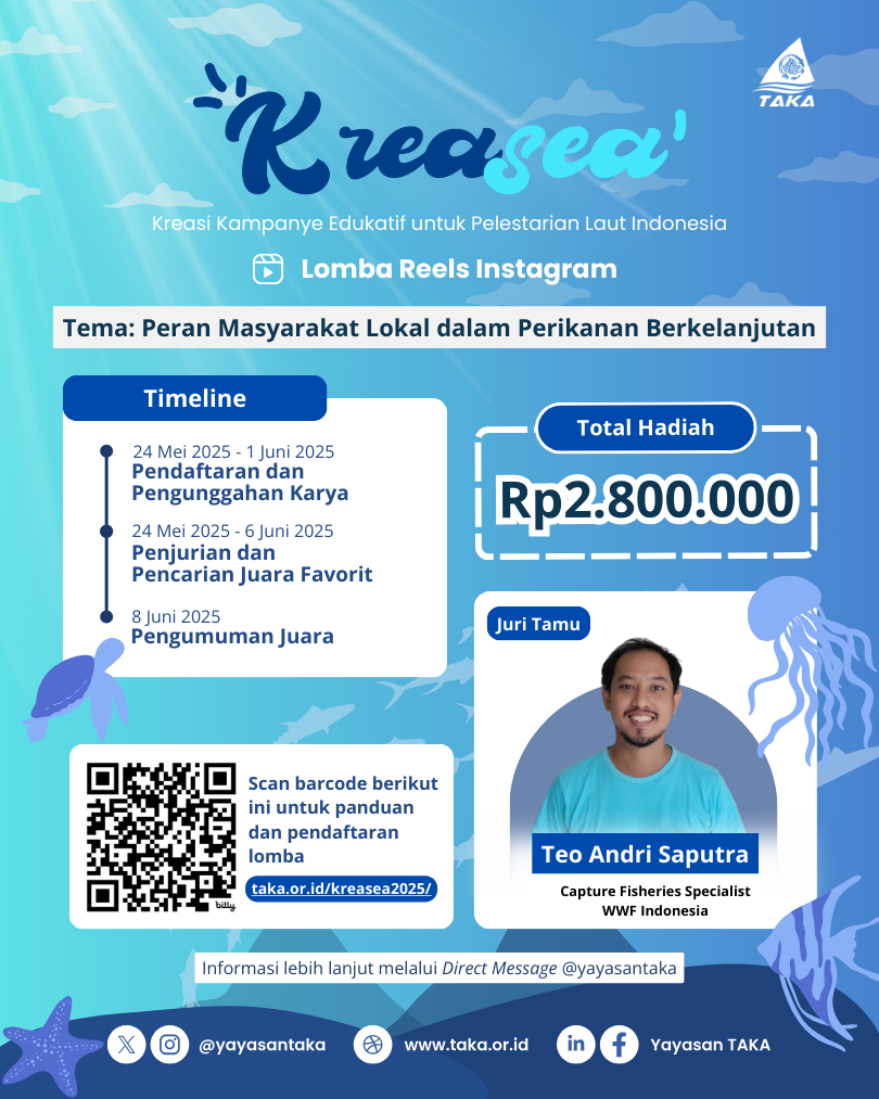 Dalam era digital saat ini, media sosial menjadi alat yang sangat efektif untuk menyebarkan inspirasi dan meningkatkan kesadaran publik. Oleh karena itu, Yayasan TAKA mempersembahkan Kreasea 2025 dengan mengusung tema “Peran Masyarakat Lokal Dalam Perikanan Berkelanjutan” untuk mengajak generasi muda, masyarakat umum, dan komunitas pesisir untuk mengangkat cerita-cerita inspiratif tentang bagaimana masyarakat lokal berkontribusi terhadap keberlanjutan sumber daya laut Indonesia. Dengan memanfaatkan kekuatan media sosial sebagai sarana edukasi dan kampanye, harapannya dapat menginspirasi lebih banyak pihak agar peduli, terlibat, dan mendukung gerakan perikanan berkelanjutan yang berakar dari komunitas lokal.
